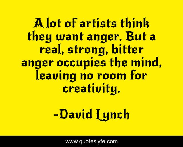 This page presents the quote "A lot of artists think they want anger. But a real, strong, bitter anger occupies the mind, leaving no room for creativity.". Author of this quote is David Lynch. This quote is about creativity, strong, mind,.