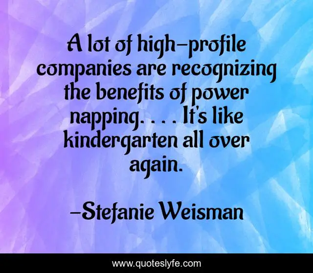 This page presents the quote "A lot of high-profile companies are recognizing the benefits of power napping. . . . It's like kindergarten all over again.". Author of this quote is Stefanie Weisman. This quote is about naps, power-napping, sleep,.