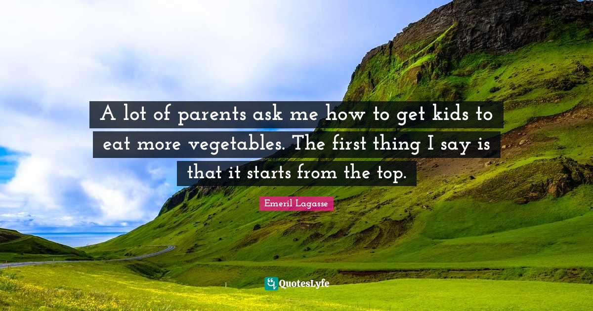 This page presents the quote "A lot of parents ask me how to get kids to eat more vegetables. The first thing I say is that it starts from the top.". Author of this quote is Emeril Lagasse. This quote is about kids, parent, vegetables, ask me,.