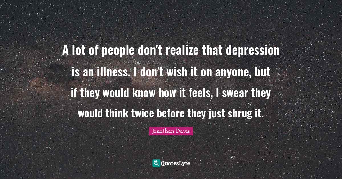 This page presents the quote "A lot of people don't realize that depression is an illness. I don't wish it on anyone, but if they would know how it feels, I swear they would think twice before they just shrug it.". Author of this quote is Jonathan Davis. This quote is about illness, wish, feels, know how, depression, people, depressing, thinking, swear,.