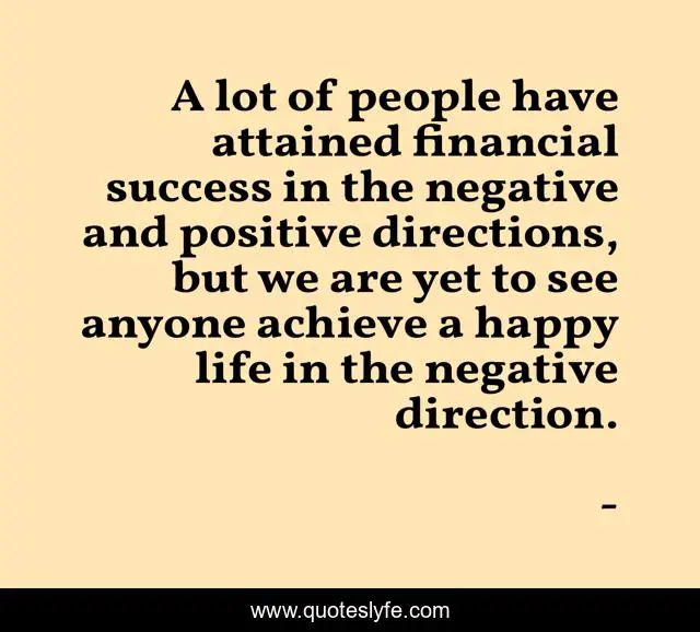 This page presents the quote "A lot of people have attained financial success in the negative and positive directions, but we are yet to see anyone achieve a happy life in the negative direction.". Author of this quote is . This quote is about living-a-happy-life, direction, attaining-financial-success, achieving-happiness, edmond-mbiaka, positive, confidence, negative, achieving-a-happy-life,.