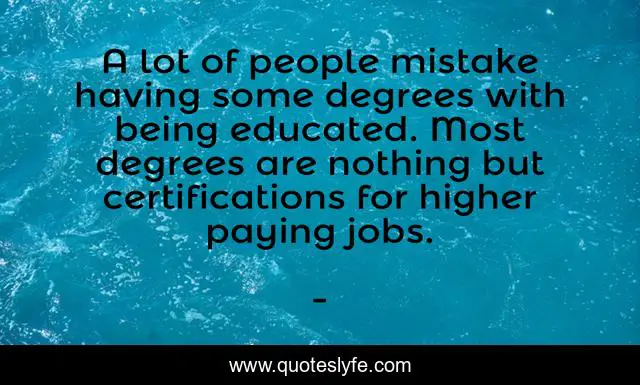This page presents the quote "A lot of people mistake having some degrees with being educated. Most degrees are nothing but certifications for higher paying jobs.". Author of this quote is . This quote is about having-degrees, edmond-mbiaka, certifications-for-job, school-education, higher-paying-jobs, college-education, being-educated,.
