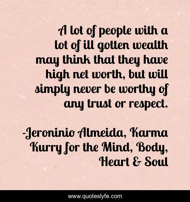 This page presents the quote "A lot of people with a lot of ill gotten wealth may think that they have high net worth, but will simply never be worthy of any trust or respect.". Author of this quote is Jeroninio Almeida, Karma Kurry for the Mind, Body, Heart & Soul. This quote is about karma-kurry, life, materialism, inspirational, enthusiasm,.
