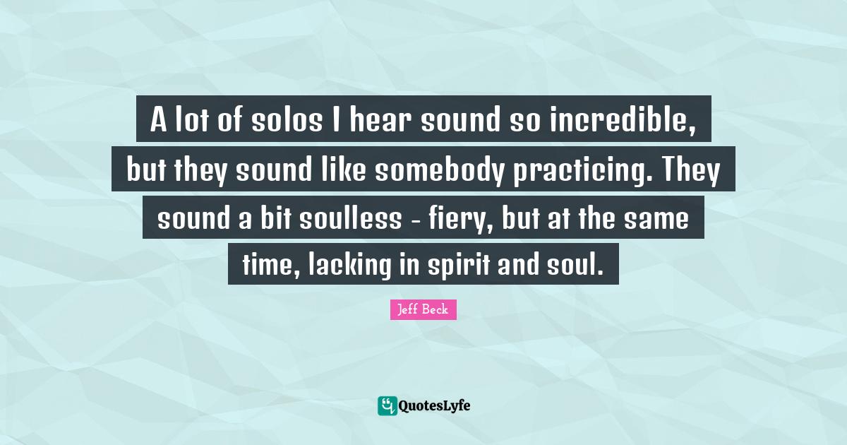This page presents the quote "A lot of solos I hear sound so incredible, but they sound like somebody practicing. They sound a bit soulless - fiery, but at the same time, lacking in spirit and soul.". Author of this quote is Jeff Beck. This quote is about sound, soul, time, fiery, soulless, spirit, spirit and soul, lacking,.