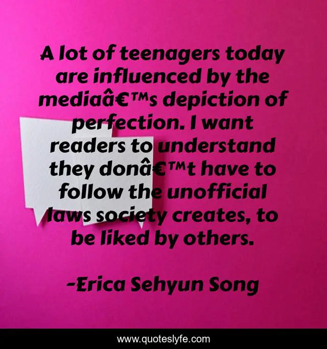 This page presents the quote "A lot of teenagers today are influenced by the media’s depiction of perfection. I want readers to understand they don’t have to follow the unofficial laws society creates, to be liked by others.". Author of this quote is Erica Sehyun Song. This quote is about teen, media, teens, perfection, teenagers,.