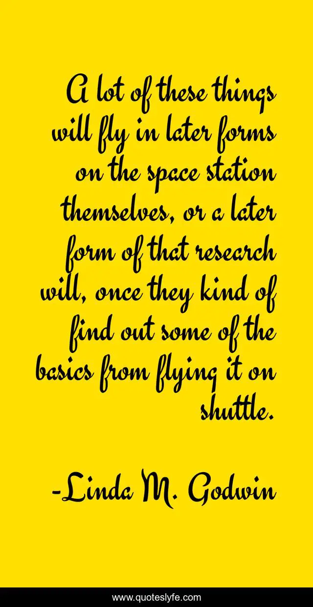 This page presents the quote "A lot of these things will fly in later forms on the space station themselves, or a later form of that research will, once they kind of find out some of the basics from flying it on shuttle.". Author of this quote is Linda M. Godwin. This quote is about fly, flying, research,.