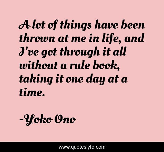 This page presents the quote "A lot of things have been thrown at me in life, and I've got through it all without a rule book, taking it one day at a time.". Author of this quote is Yoko Ono. This quote is about life, book, day,.