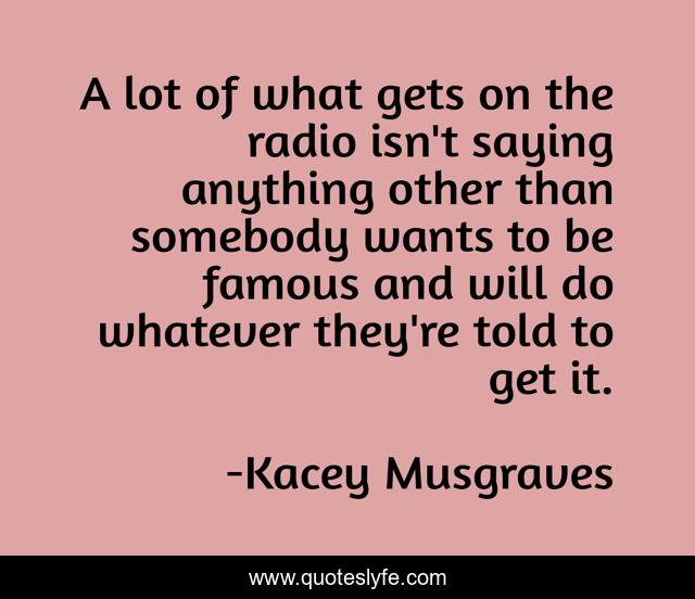 This page presents the quote "A lot of what gets on the radio isn't saying anything other than somebody wants to be famous and will do whatever they're told to get it.". Author of this quote is Kacey Musgraves. This quote is about saying, radio, anything,.