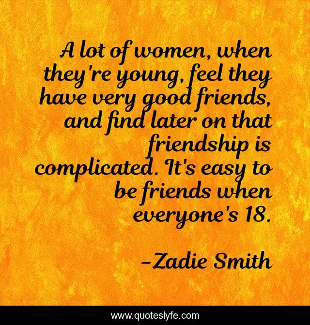This page presents the quote "A lot of women, when they're young, feel they have very good friends, and find later on that friendship is complicated. It's easy to be friends when everyone's 18.". Author of this quote is Zadie Smith. This quote is about good, friends, women,.