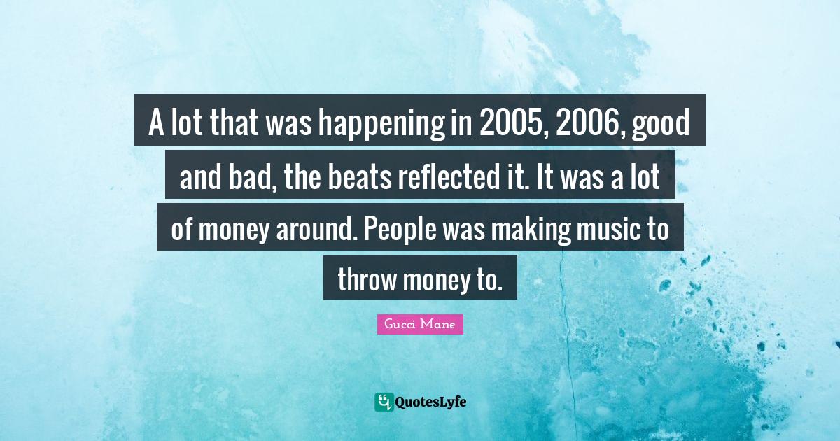 This page presents the quote "A lot that was happening in 2005, 2006, good and bad, the beats reflected it. It was a lot of money around. People was making music to throw money to.". Author of this quote is Gucci Mane. This quote is about money, good and bad, people, beats, music,.