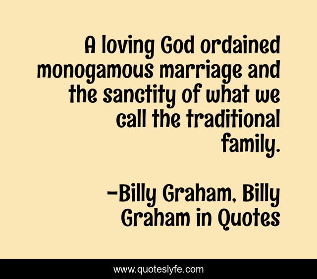 This page presents the quote "A loving God ordained monogamous marriage and the sanctity of what we call the traditional family.". Author of this quote is Billy Graham, Billy Graham in Quotes. This quote is about marriage, billy-graham,.