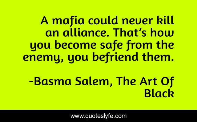 This page presents the quote "A mafia could never kill an alliance. That’s how you become safe from the enemy, you befriend them.". Author of this quote is Basma Salem, The Art Of Black. This quote is about enemy, mafia, friends, gang,.