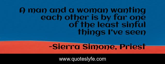 This page presents the quote "A man and a woman wanting each other is by far one of the least sinful things I've seen". Author of this quote is Sierra Simone, Priest. This quote is about desire, lust, love, sin, affection,.