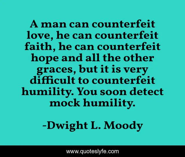 This page presents the quote "A man can counterfeit love, he can counterfeit faith, he can counterfeit hope and all the other graces, but it is very difficult to counterfeit humility. You soon detect mock humility.". Author of this quote is Dwight L. Moody. .