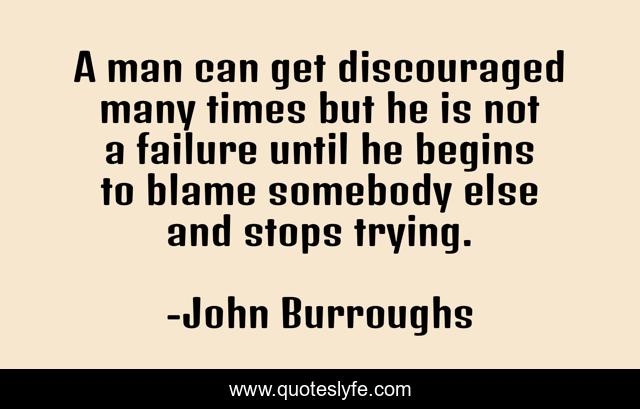 This page presents the quote "A man can get discouraged many times but he is not a failure until he begins to blame somebody else and stops trying.". Author of this quote is John Burroughs. This quote is about blame, trying, man,.