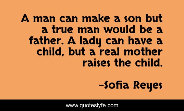 This page presents the quote "A man can make a son but a true man would be a father. A lady can have a child, but a real mother raises the child.". Author of this quote is Sofia Reyes. This quote is about parenthood, insipirational, love, affection,.