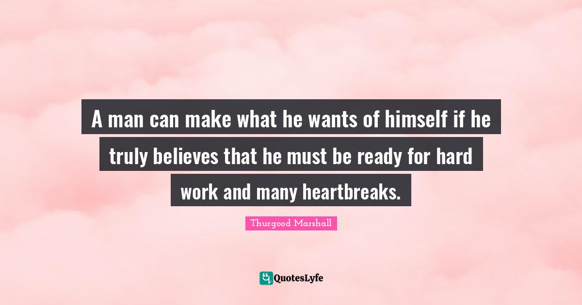 This page presents the quote "A man can make what he wants of himself if he truly believes that he must be ready for hard work and many heartbreaks.". Author of this quote is Thurgood Marshall. This quote is about believe, hard work, men, ready,.