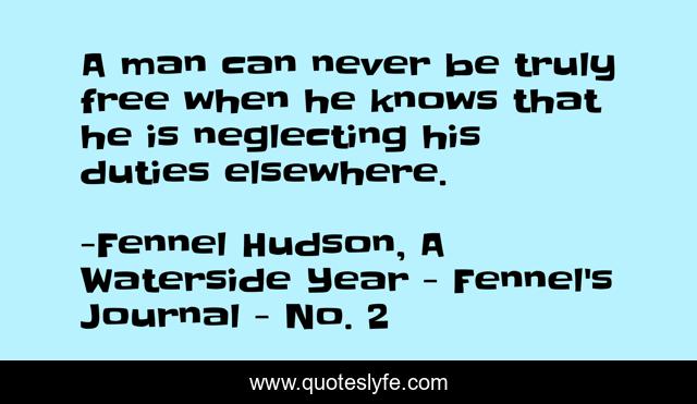 This page presents the quote "A man can never be truly free when he knows that he is neglecting his duties elsewhere.". Author of this quote is Fennel Hudson, A Waterside Year - Fennel's Journal - No. 2. .