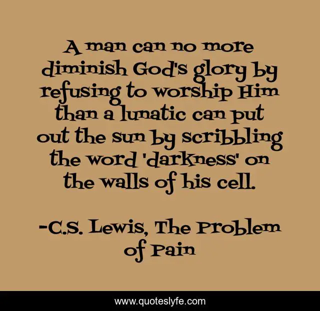 This page presents the quote "A man can no more diminish God's glory by refusing to worship Him than a lunatic can put out the sun by scribbling the word 'darkness' on the walls of his cell.". Author of this quote is C.S. Lewis, The Problem of Pain. This quote is about god, religion,.