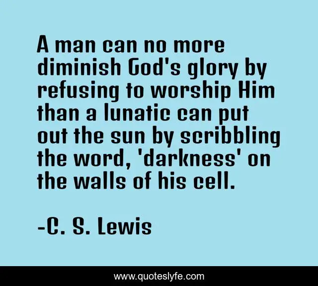 This page presents the quote "A man can no more diminish God's glory by refusing to worship Him than a lunatic can put out the sun by scribbling the word, 'darkness' on the walls of his cell.". Author of this quote is C. S. Lewis. This quote is about sun, darkness, man,.