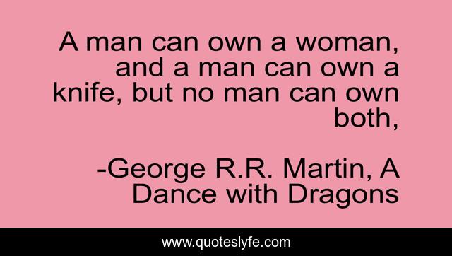 This page presents the quote "A man can own a woman, and a man can own a knife, but no man can own both, ". Author of this quote is George R.R. Martin, A Dance with Dragons. This quote is about woman, knife,.