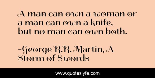 This page presents the quote "A man can own a woman or a man can own a knife, but no man can own both.". Author of this quote is George R.R. Martin, A Storm of Swords. This quote is about knife, wife,.