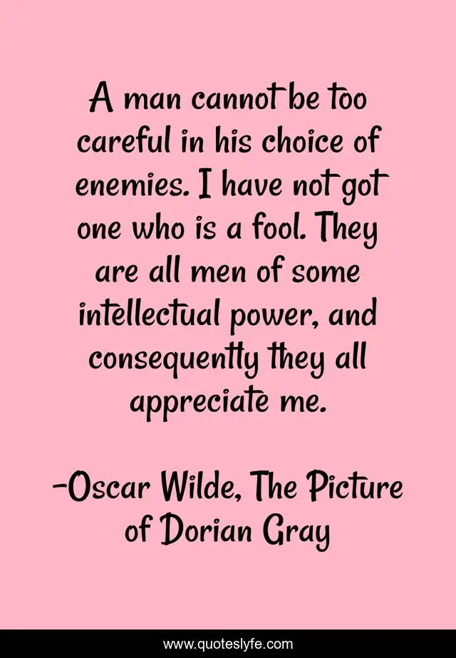 This page presents the quote "A man cannot be too careful in his choice of enemies. I have not got one who is a fool. They are all men of some intellectual power, and consequently they all appreciate me.". Author of this quote is Oscar Wilde, The Picture of Dorian Gray. .