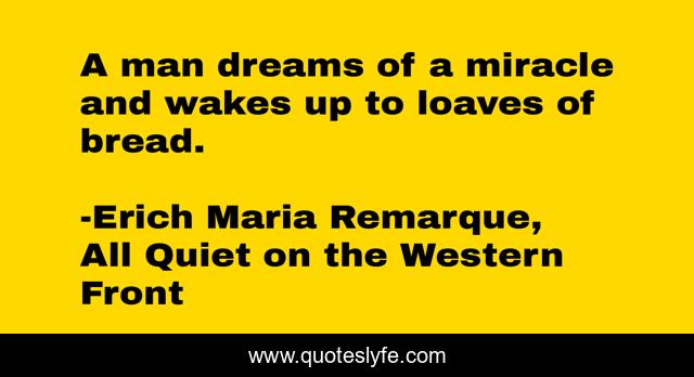 This page presents the quote "A man dreams of a miracle and wakes up to loaves of bread.". Author of this quote is Erich Maria Remarque, All Quiet on the Western Front. This quote is about miracles, front-lines, miracle, all-quiet-on-the-western-front, soldiers, wwi, war,.