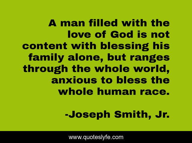 This page presents the quote "A man filled with the love of God is not content with blessing his family alone, but ranges through the whole world, anxious to bless the whole human race.". Author of this quote is Joseph Smith, Jr.. This quote is about faith, love, affection, god,.