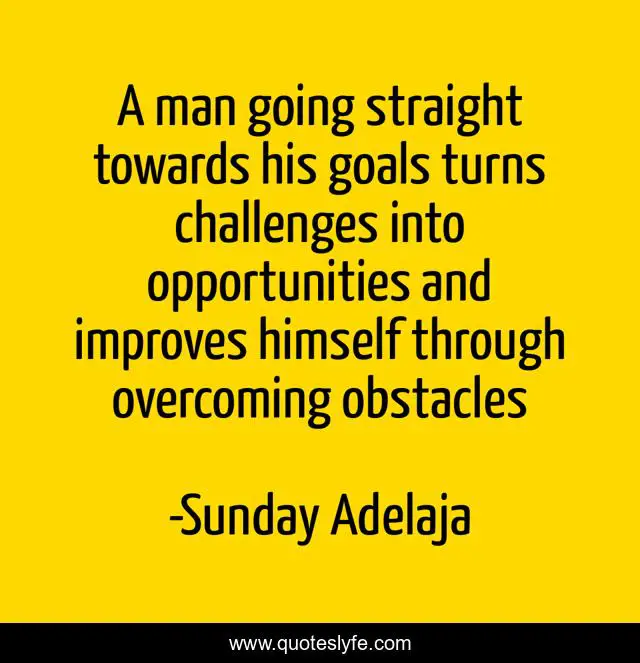 This page presents the quote "A man going straight towards his goals turns challenges into opportunities and improves himself through overcoming obstacles". Author of this quote is Sunday Adelaja. This quote is about straight, obstacles, opportunities, challenges, self-improvement, man, overcome, goals,.