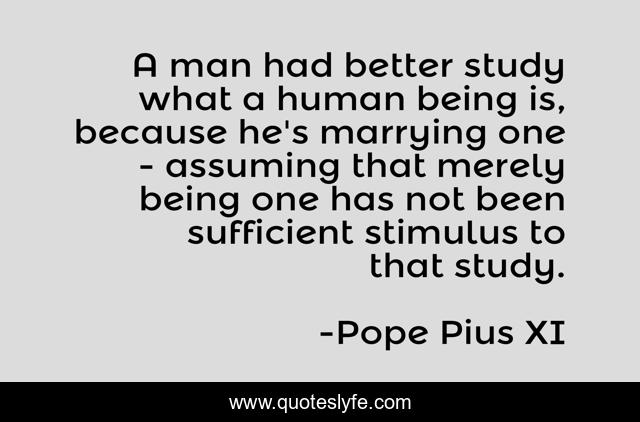 This page presents the quote "A man had better study what a human being is, because he's marrying one - assuming that merely being one has not been sufficient stimulus to that study.". Author of this quote is Pope Pius XI. This quote is about anthropology, marriage-advice, marriage,.