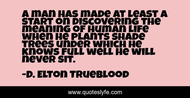 This page presents the quote "A man has made at least a start on discovering the meaning of human life when he plants shade trees under which he knows full well he will never sit.". Author of this quote is D. Elton Trueblood. This quote is about life, trees, man,.
