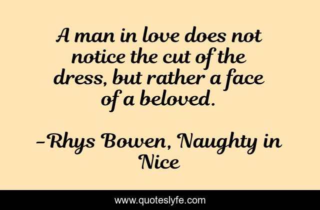 This page presents the quote "A man in love does not notice the cut of the dress, but rather a face of a beloved.". Author of this quote is Rhys Bowen, Naughty in Nice. This quote is about true-self, romantic, insightful,.