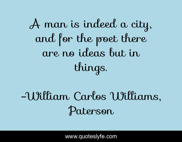 This page presents the quote "A man is indeed a city, and for the poet there are no ideas but in things.". Author of this quote is William Carlos Williams, Paterson. This quote is about ideas, man,.