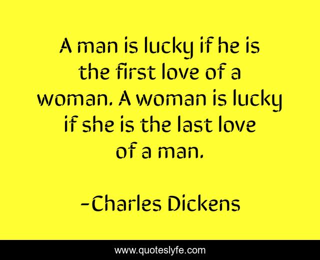 This page presents the quote "A man is lucky if he is the first love of a woman. A woman is lucky if she is the last love of a man.". Author of this quote is Charles Dickens. This quote is about relationships, love, men, first-love, gender-roles, love-makes-you-do-the-wacky, last-love, men-mars-women-venus, affection,.