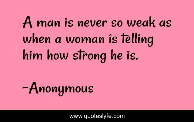 This page presents the quote "A man is never so weak as when a woman is telling him how strong he is.". Author of this quote is Anonymous. This quote is about men, women,.