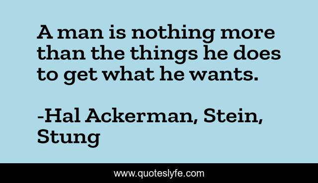 This page presents the quote "A man is nothing more than the things he does to get what he wants.". Author of this quote is Hal Ackerman, Stein, Stung. .