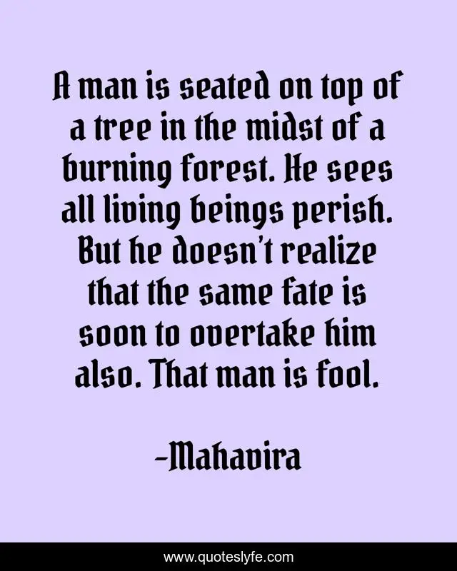 This page presents the quote "A man is seated on top of a tree in the midst of a burning forest. He sees all living beings perish. But he doesn’t realize that the same fate is soon to overtake him also. That man is fool.". Author of this quote is Mahavira. This quote is about fool, life, remedial, fate, quote, actions, mahāvīra, behaviour, attitude,.