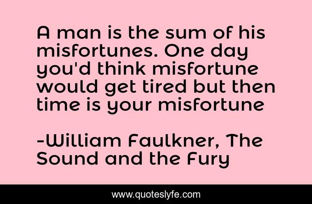 This page presents the quote "A man is the sum of his misfortunes. One day you'd think misfortune would get tired but then time is your misfortune". Author of this quote is William Faulkner, The Sound and the Fury. This quote is about misfortune, time,.
