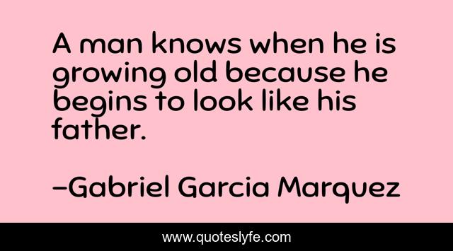 This page presents the quote "A man knows when he is growing old because he begins to look like his father.". Author of this quote is Gabriel Garcia Marquez. This quote is about father, look, man,.