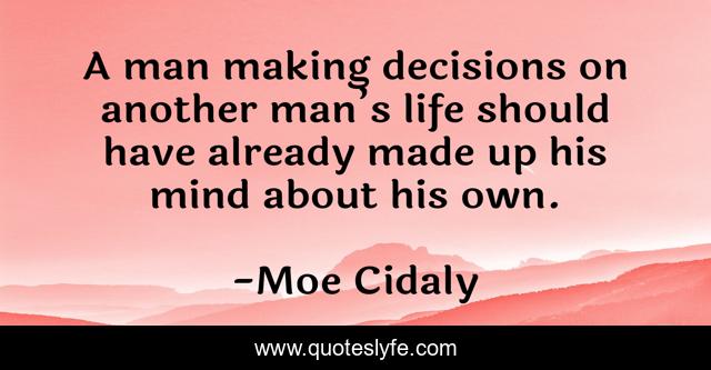 This page presents the quote "A man making decisions on another man’s life should have already made up his mind about his own.". Author of this quote is Moe Cidaly. This quote is about decision, decision-making, decisions, making-decision, making-decisions,.