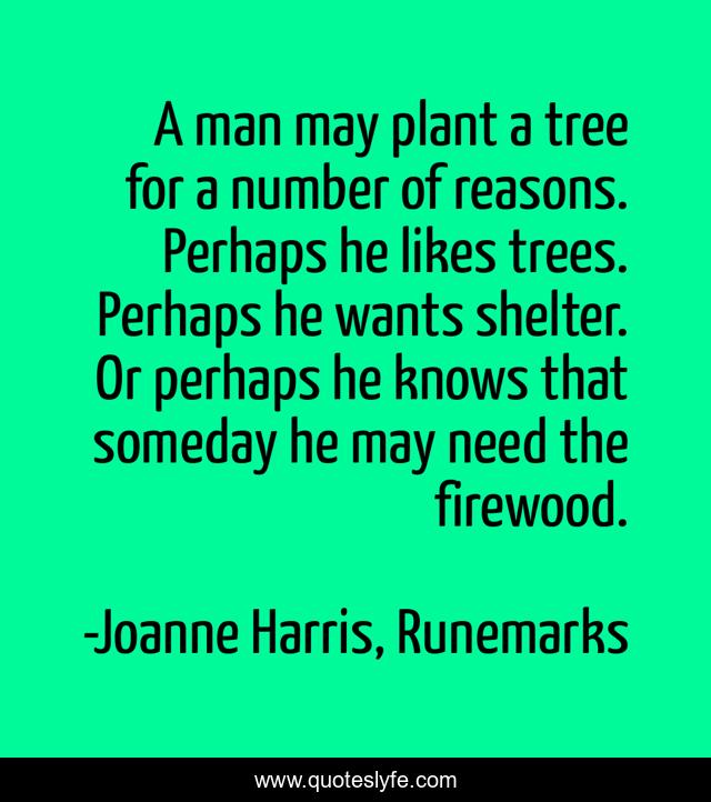 This page presents the quote "A man may plant a tree for a number of reasons. Perhaps he likes trees. Perhaps he wants shelter. Or perhaps he knows that someday he may need the firewood.". Author of this quote is Joanne Harris, Runemarks. This quote is about foresight, motive, planning, purpose, strategy,.
