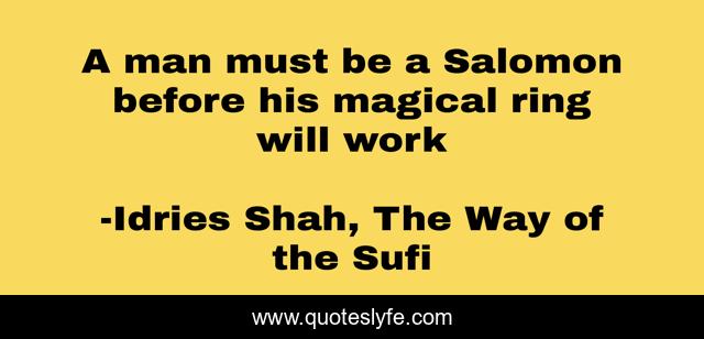 This page presents the quote "A man must be a Salomon before his magical ring will work". Author of this quote is Idries Shah, The Way of the Sufi. This quote is about salomon, psychology, goethe, religion, wisdom, sufism, hafiz, sufis,.