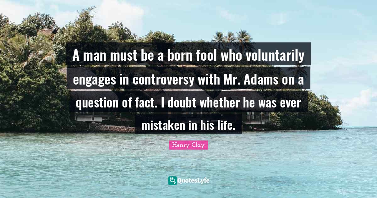 This page presents the quote "A man must be a born fool who voluntarily engages in controversy with Mr. Adams on a question of fact. I doubt whether he was ever mistaken in his life.". Author of this quote is Henry Clay. This quote is about men, life, fool, controversy, doubt, born, mistaken,.