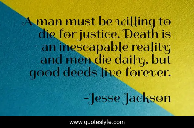 This page presents the quote "A man must be willing to die for justice. Death is an inescapable reality and men die daily, but good deeds live forever.". Author of this quote is Jesse Jackson. This quote is about justice, good, daily,.