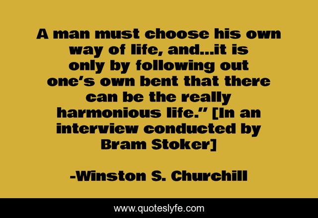 This page presents the quote "A man must choose his own way of life, and…it is only by following out one’s own bent that there can be the really harmonious life.” [In an interview conducted by Bram Stoker]". Author of this quote is Winston S. Churchill. .