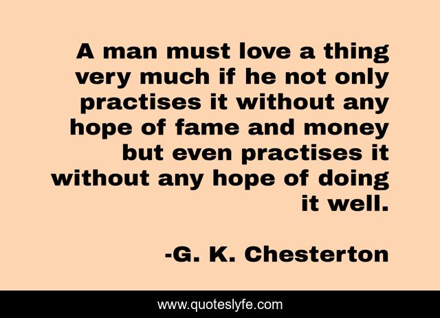 This page presents the quote "A man must love a thing very much if he not only practises it without any hope of fame and money but even practises it without any hope of doing it well.". Author of this quote is G. K. Chesterton. .