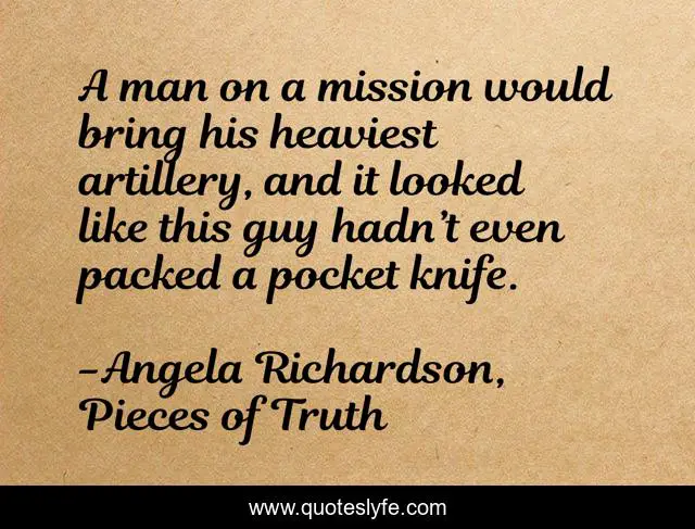 This page presents the quote "A man on a mission would bring his heaviest artillery, and it looked like this guy hadn’t even packed a pocket knife.". Author of this quote is Angela Richardson, Pieces of Truth. This quote is about chasing, mission, chase,.