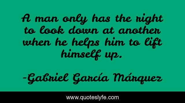 This page presents the quote "A man only has the right to look down at another when he helps him to lift himself up.". Author of this quote is Gabriel García Márquez. This quote is about marquez, enthusiasm, help, inspirational, man,.