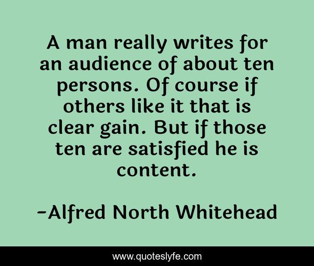 This page presents the quote "A man really writes for an audience of about ten persons. Of course if others like it that is clear gain. But if those ten are satisfied he is content.". Author of this quote is Alfred North Whitehead. This quote is about writers, writing,.